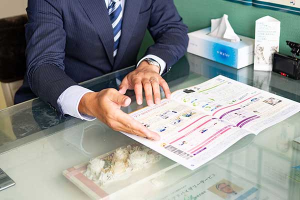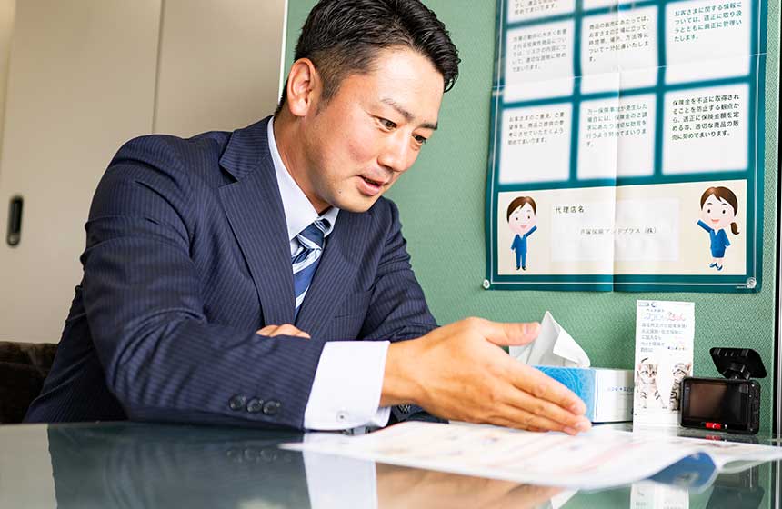 基本理念にもある「顔が見えるサービス」です。地域密着型保険代理店の特長を活かし、直接、お客様と顔を合わせて会話を交わしながらサービスを提供することを心がけています。他社との差別化にもつながっています。